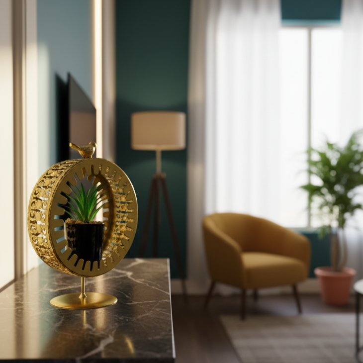 Add a touch of nature and charm to your space with this elegantly designed metal frame planter, featuring a perched golden bird accent on top. The circular frame stands gracefully on a sturdy base, holding a black ceramic pot with a lifelike cactus plant and decorative stones. Its minimalist yet artistic appeal makes it a perfect addition for tabletops, shelves, office desks, or as a thoughtful gift. A stylish blend of nature and modern design—ideal for home or office decor.