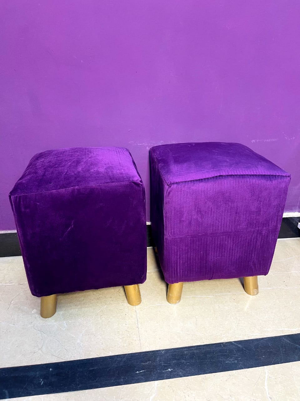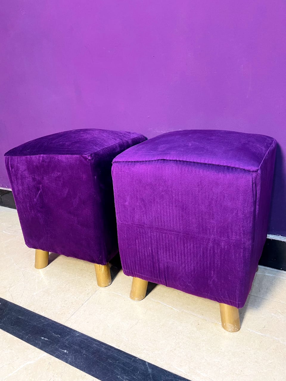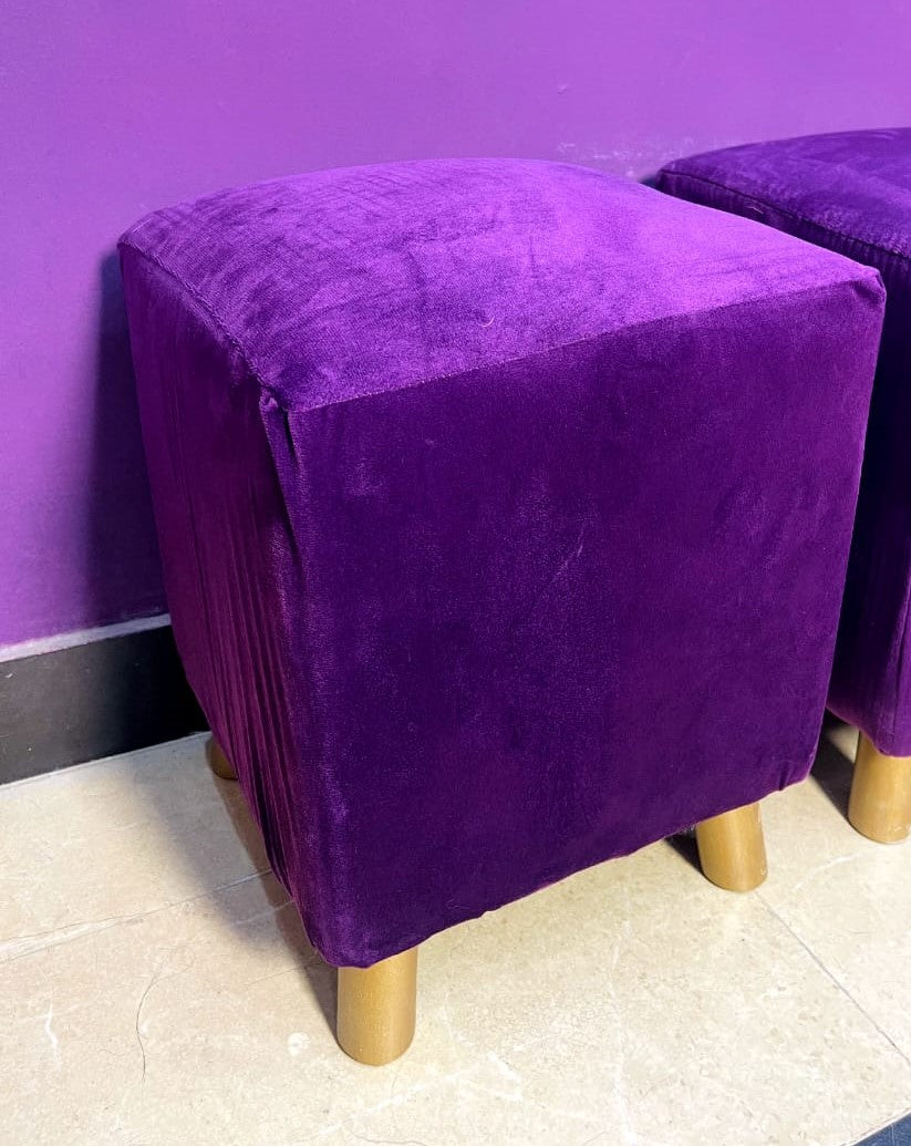 Purple Velvet Ottoman Stool Set – Wooden Legs, Soft Finish